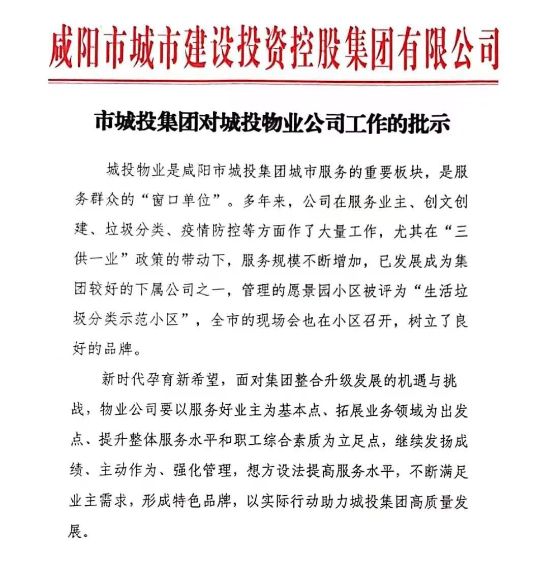 會(huì)議開(kāi)始前,王雅玲宣讀《市城投集團(tuán)對(duì)城投物業(yè)公司工作的批示》。批示中指出,多年來(lái),城投物業(yè)在服務(wù)業(yè)主、創(chuàng)文創(chuàng)建、垃圾分類(lèi)、疫情防控等方面作了大量的工作,尤其在“三供一業(yè)”政策的帶動(dòng)下,服務(wù)規(guī)模不斷增加,已成為集團(tuán)較好的下屬公司之一,樹(shù)立了良好的品牌。希望城投物業(yè)在今后的工作中,繼續(xù)發(fā)揚(yáng)成績(jī)、主動(dòng)作為、強(qiáng)化管理,想方設(shè)法提高服務(wù)水平,以實(shí)際行動(dòng)助力城投集團(tuán)高質(zhì)量發(fā)展。
