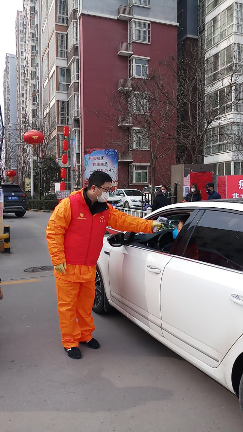 志愿者對(duì)進(jìn)入小區(qū)車輛上的司乘人員進(jìn)行測(cè)溫